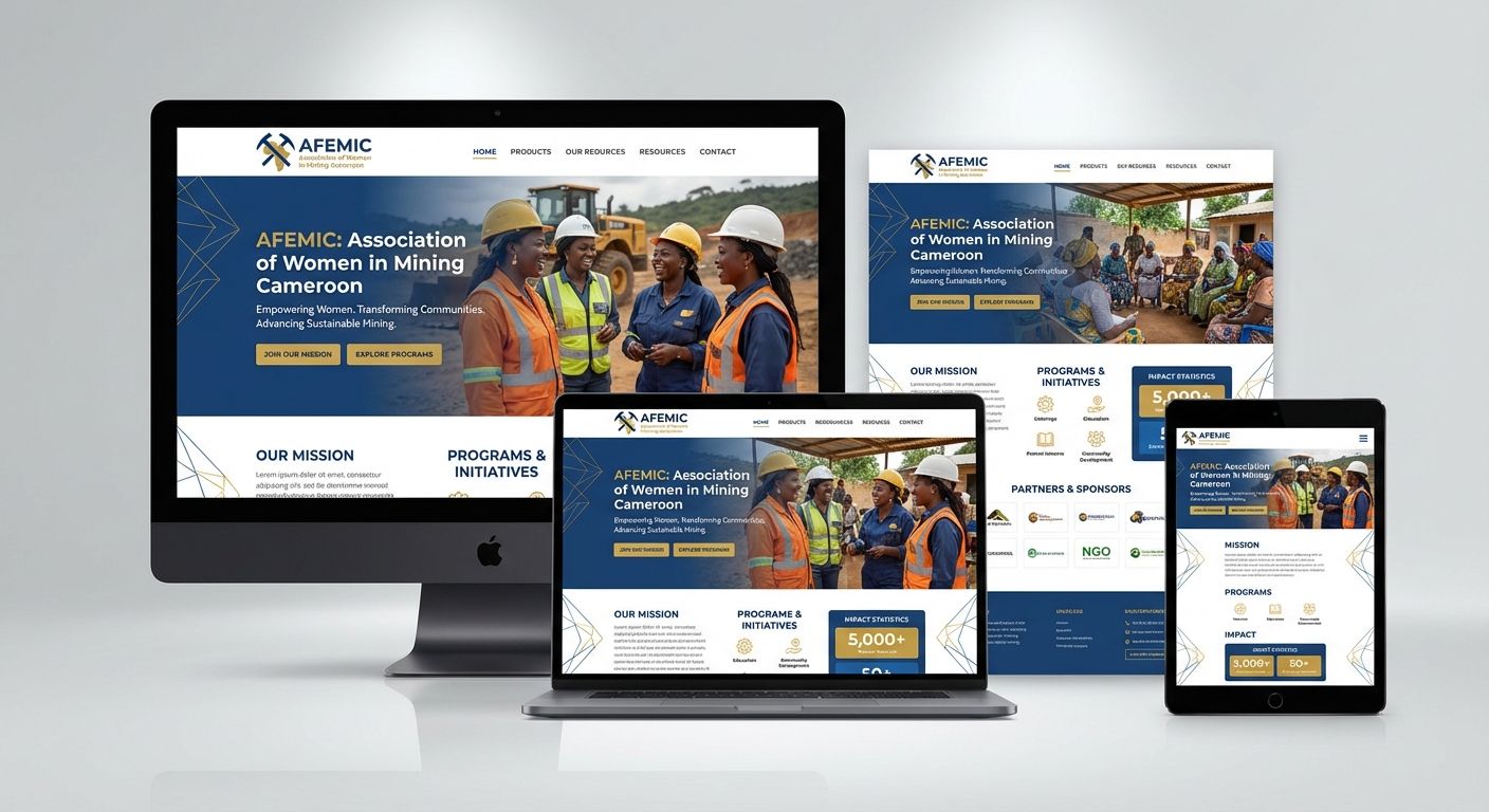 Au Cameroun, AFEMIC, Association des Femmes du Secteur Minier, avait besoin d'une plateforme institutionnelle claire pour valoriser sa mission, ses actions de terrain et ses evenements majeurs. L'objectif etait de renforcer la visibilite de l'organisation et de faciliter l'engagement des membres et partenaires autour de l'inclusion des femmes dans les metiers miniers en Afrique centrale.