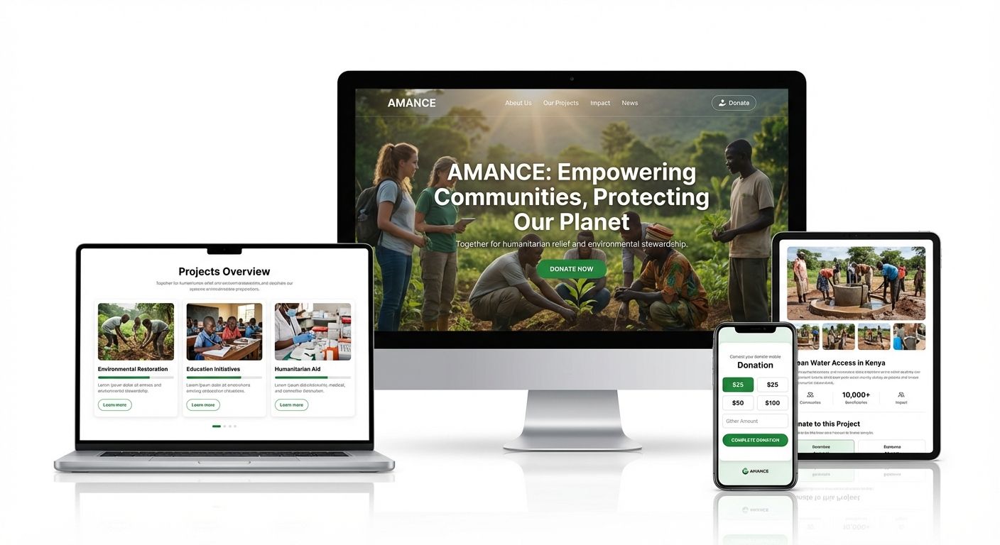 AMANCE est une organisation camerounaise engagee dans l'action humanitaire et la conservation environnementale, basee a Buea. Dans un contexte de besoin croissant de visibilite internationale, l'association avait besoin d'une presence digitale forte, capable de traduire ses valeurs de compassion et d'integrite, tout en facilitant l'engagement des donateurs, benevoles et partenaires.