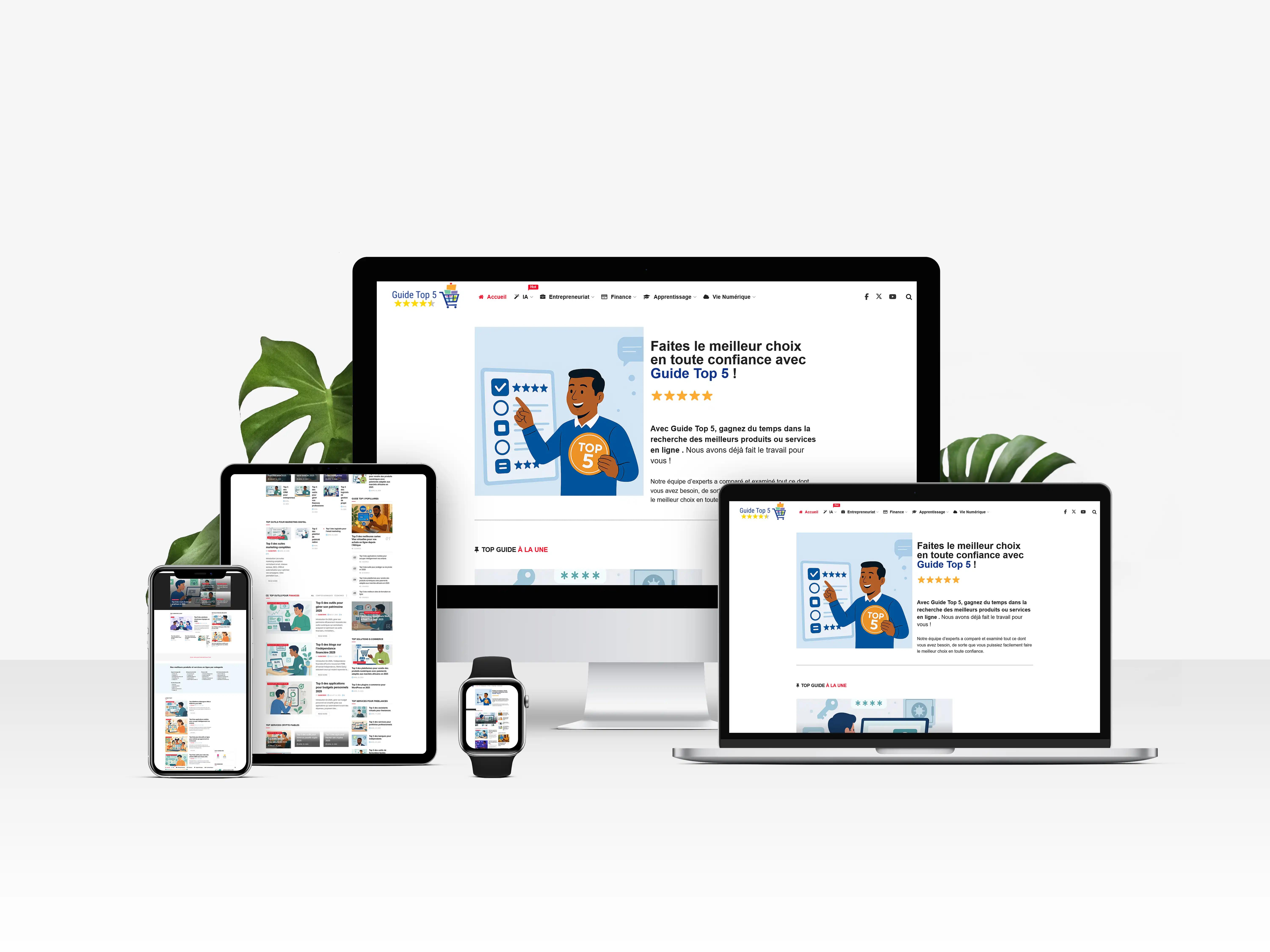 En Afrique francophone, GuideTop5 est un media de recommandations qui publie des comparatifs et classements dans plusieurs verticales : IA, entrepreneuriat, finance, cloud et vie numerique. Le projet visait a optimiser la decouvrabilite des contenus et la qualite du parcours de lecture.